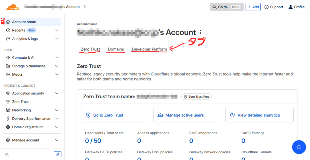 左のナビゲーションから Account home を表示すると「<ユーザ名>’s Account」が表示され、その下にタブが表示される。この状態では Zero Trust と Domain と Developer Platform の 3 つがある。この Domain をクリックする。