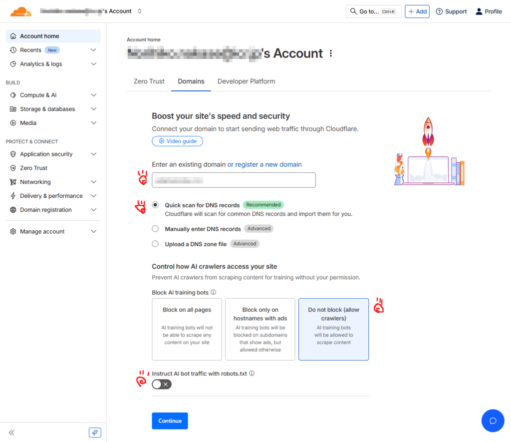 Domain タブが選択された状態になると、Boost your site’s speed and security と表示されているので、使うドメイン名を入力して、ラジオボタンでは Quick scan for DNS records を選択、Instruct AI bot traffic with robots.txt をオフにして、Continue をクリックする。