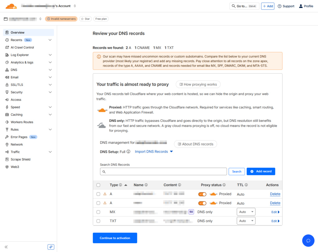 スキャン結果が表示される。普通ならこの段階で変更することはないはず。Cloudflare に DNS サーバを移すことで MX などちゃんと使えるのかという問題もあるので、必要ないレコードは削除して良いだろう。