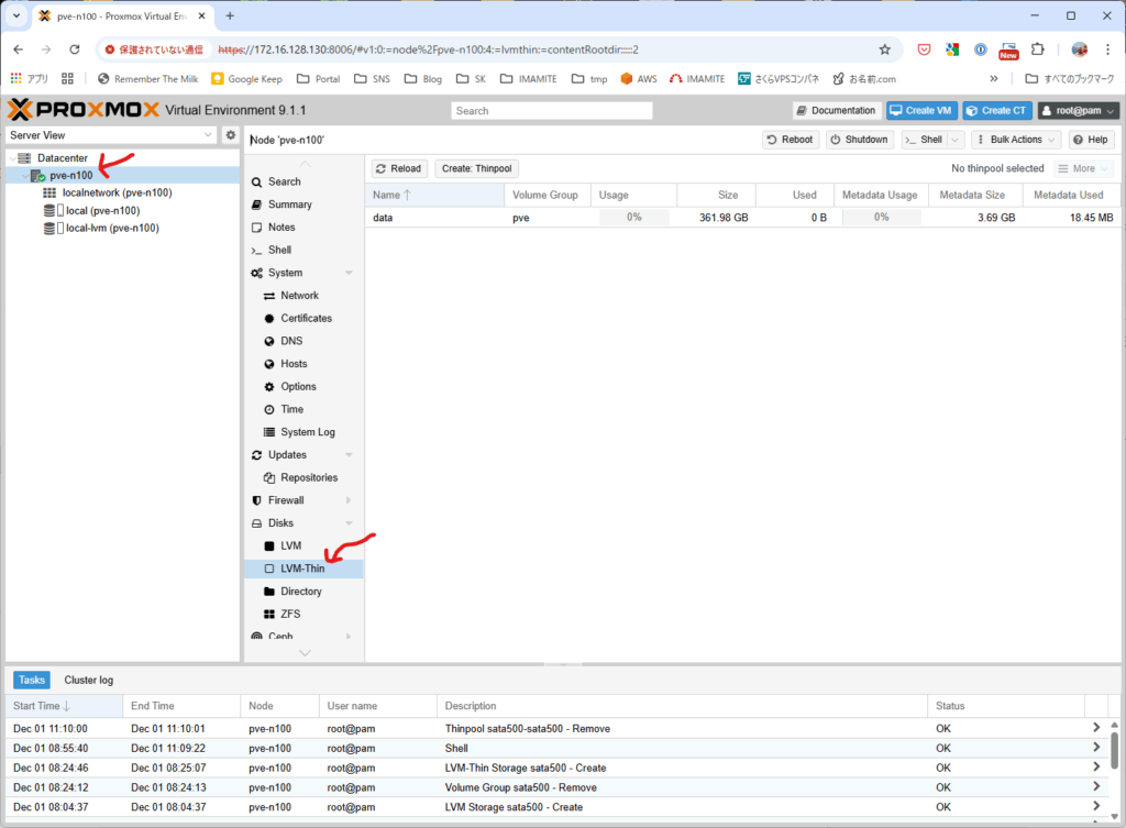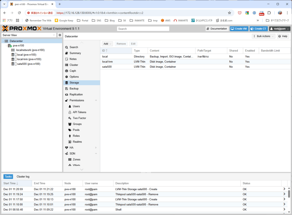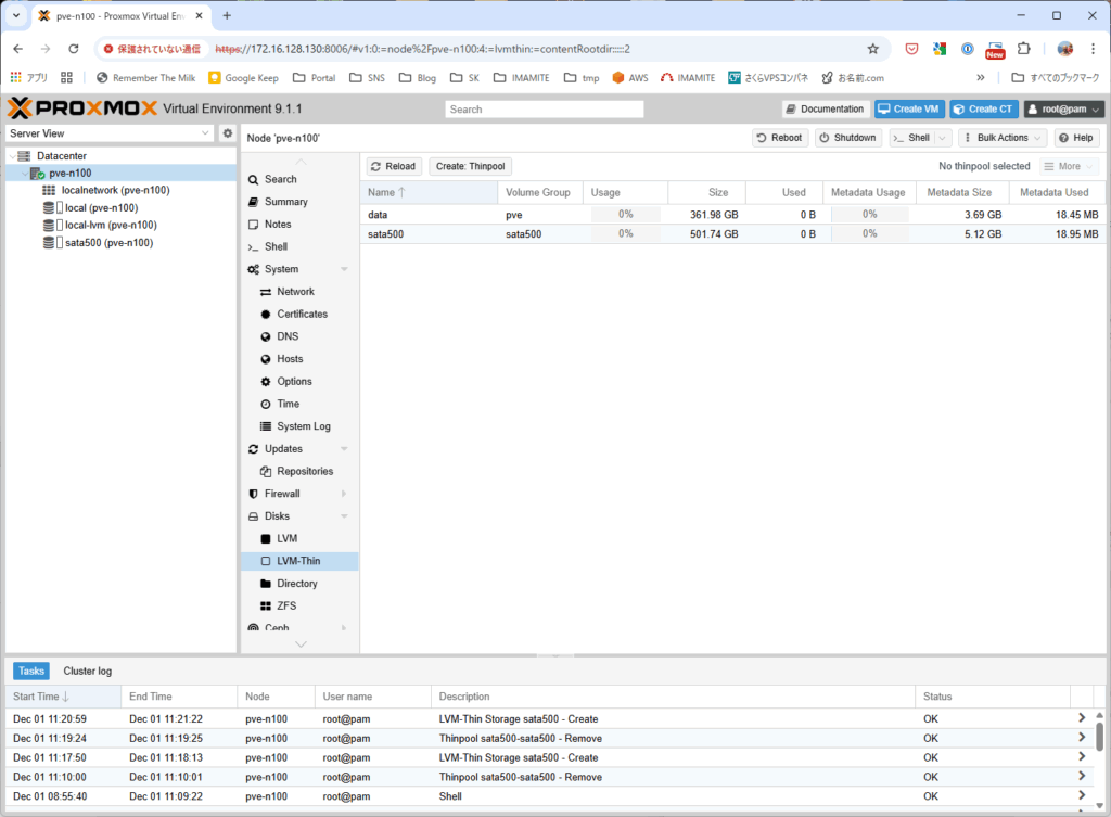 sata500 ができた画面。LVM-Thin のリストにも、左側ツリーの部分にも sata500 がある。