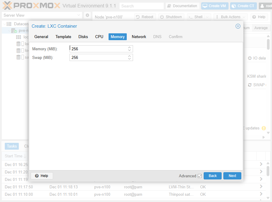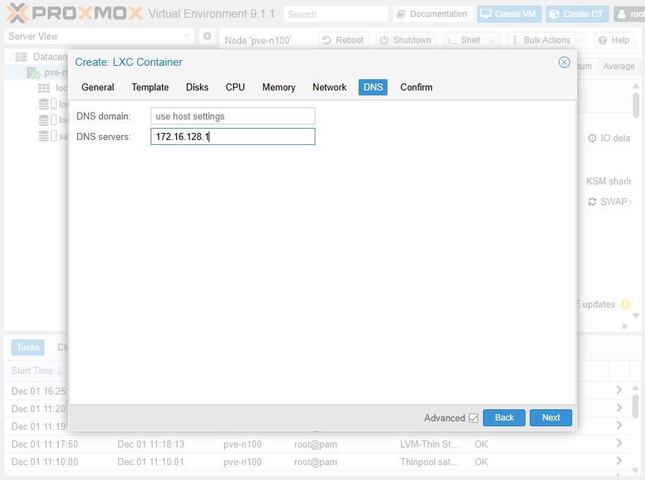 左のツリーで Datacenter > pve-n100 を選択して、Create CT ボタンをクリック。あとから dnsmasq を入れるのでちゃんとつくる。