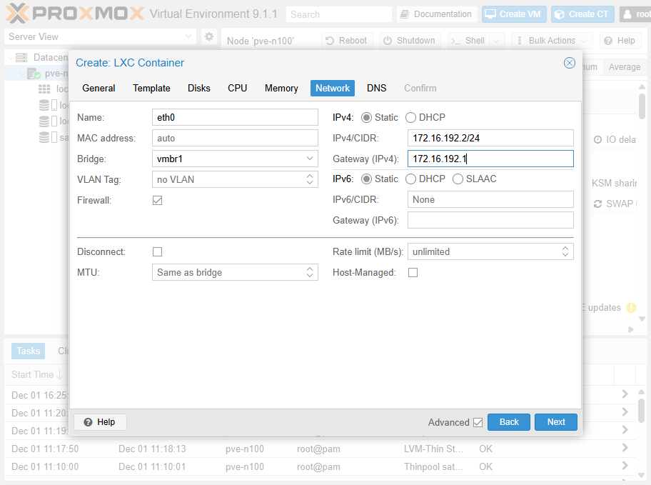 肝心のネットワーク。Bridge: vmbr1、IPv4/CIDR: 172.16.192.2/24、Gateway (IPv4): 172.16.192.1 としておく。