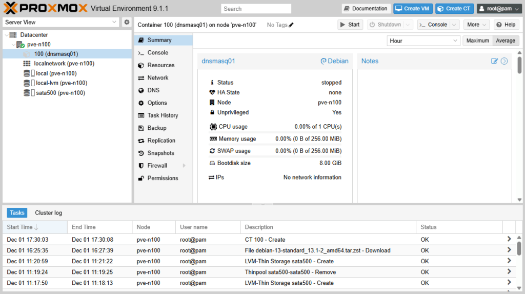 左側のツリー Datacenter >pve-n100 > 100 (dnsmasq01) ができた。